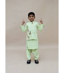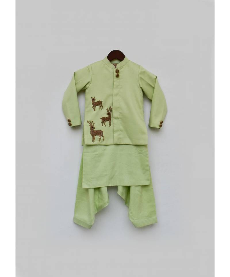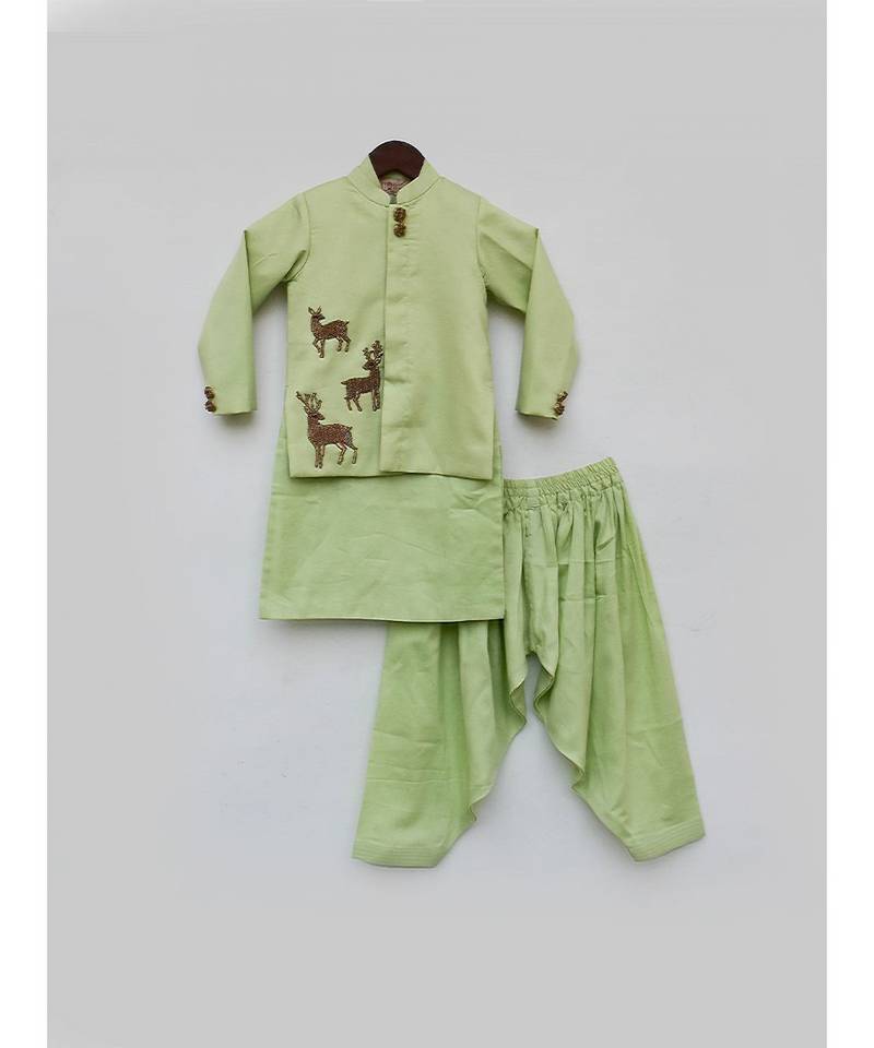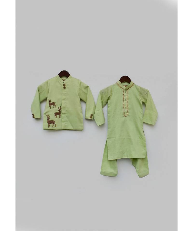 Product Description | How Smart And Dapper Look Does This Green Kurta Jacket And Salwar Set Look With Motifs On It. How Smartly Can You Use This With Or Without The Jacket And It Will Still Look As Smart And Dapper On Your Champ. |