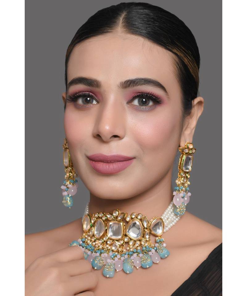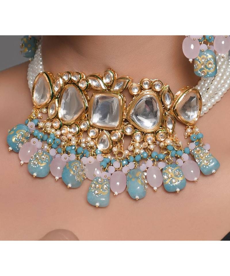 | Product Name | Pastel Blue And Pink Tanjore Beaded Handcrafted Kundan Necklace With Earrings | |
