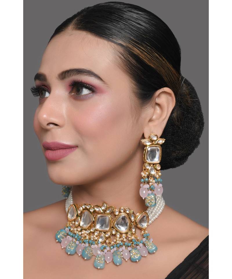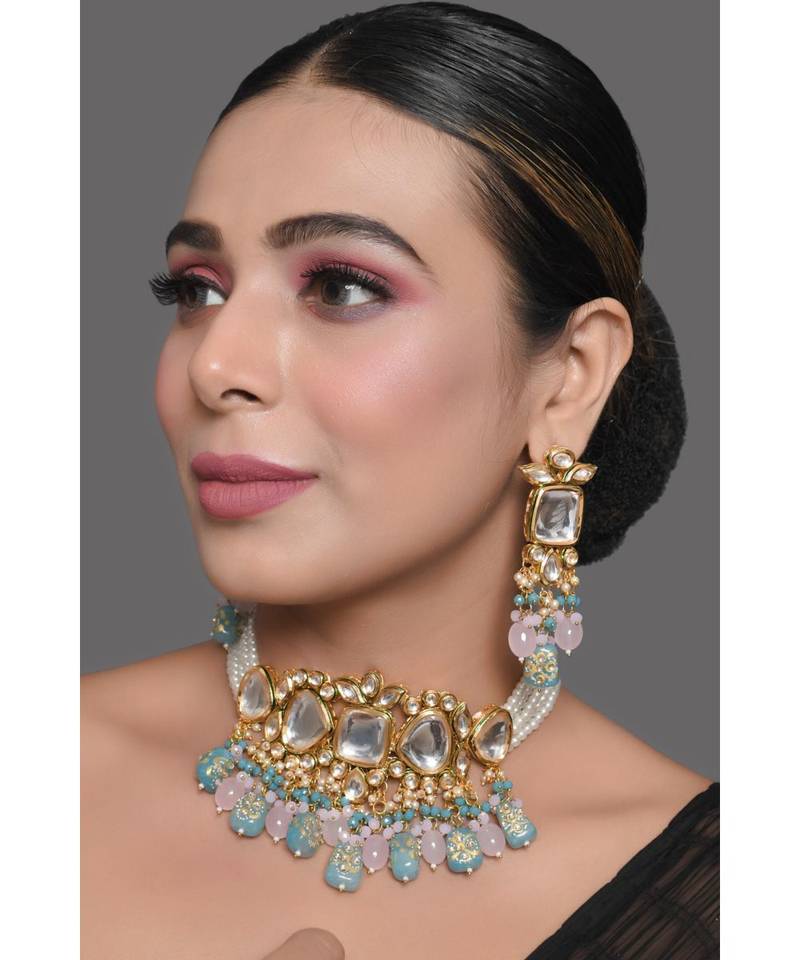 Pastel blue and pink tanjore beaded handcrafted kundan necklace with earrings