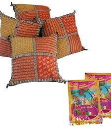 Product Description | A. Get This Multicolour 5 Piece Cushion Cover Set Graced With Bagru Print On This Auspicious Holi. Each Cover Is Embellished With Assorted Multi Colour Print To Give It A Traditional Glimpse. These Handmade Fluffy Pure Cotton Cushion Covers Show Case The Craftmanship Of Rajasthan. These Good Looking Cushion Covers Are Specialty Of Jaipur. Specifications Material: Pure Cotton B. This Holi Gift Also Contains Free Two Packs Of (100 Gm Each) Herbal Gulal (Abeer). |