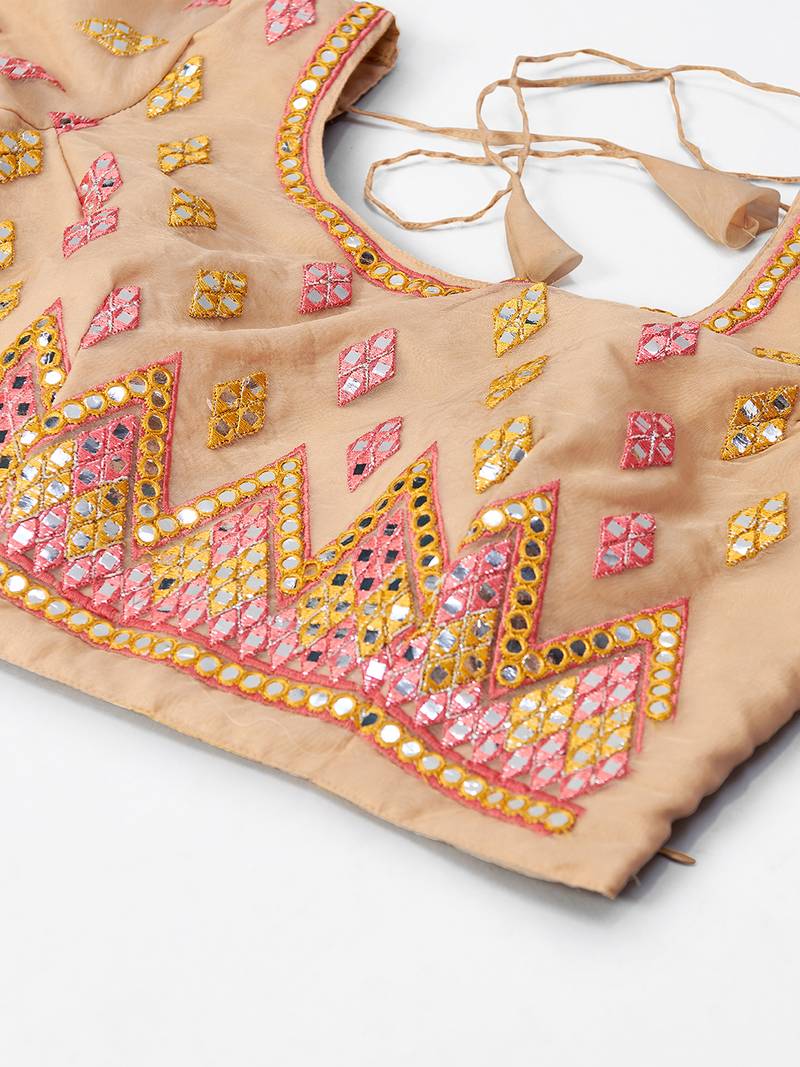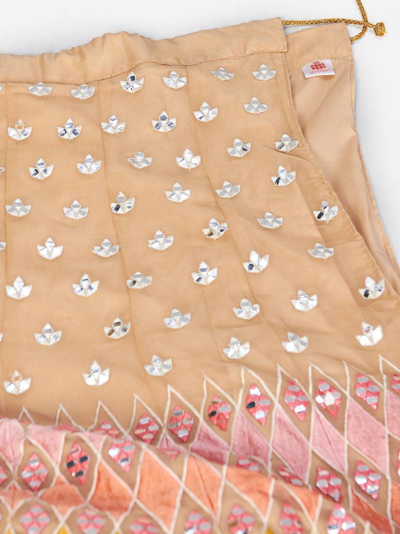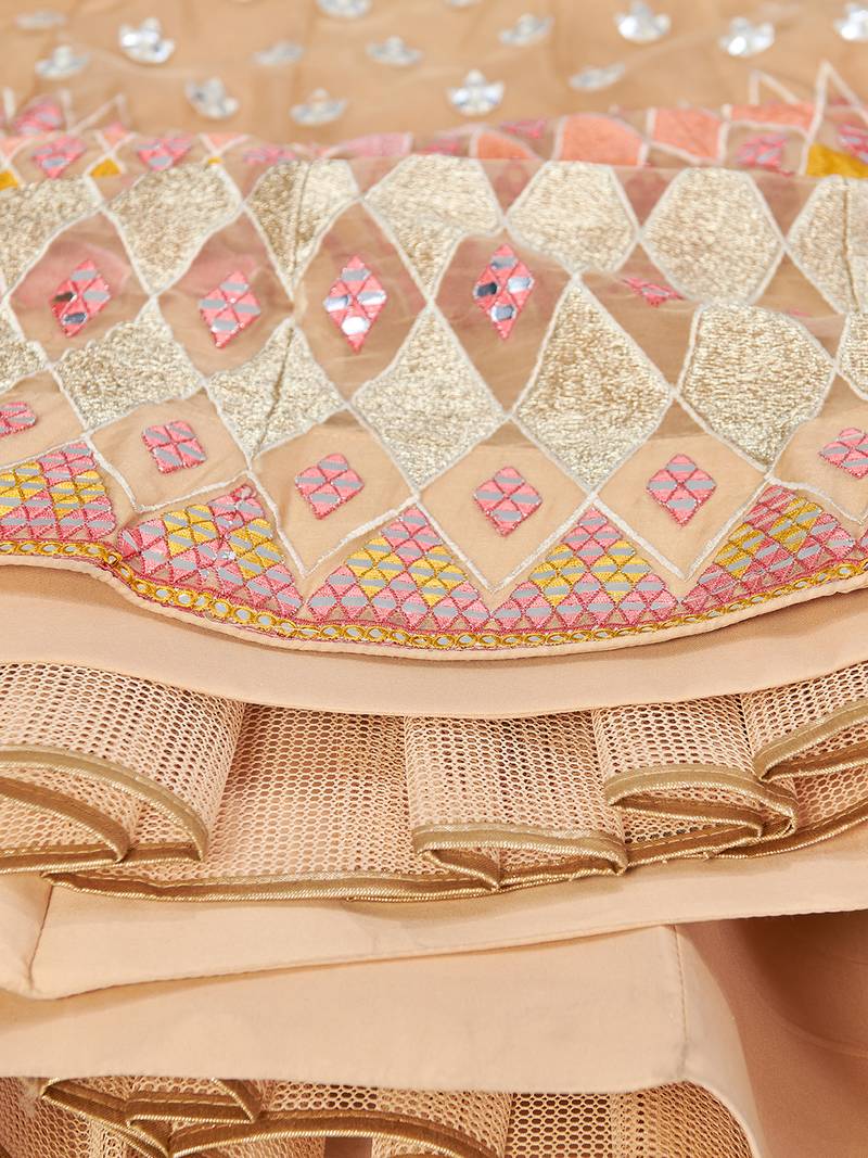 Beguiling beige thread embroidered with foil mirror and cut work soft tissue organza semi stitched lehenga