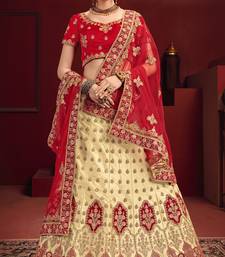 Beige thread embroidery satin semi stitched wedding lehenga