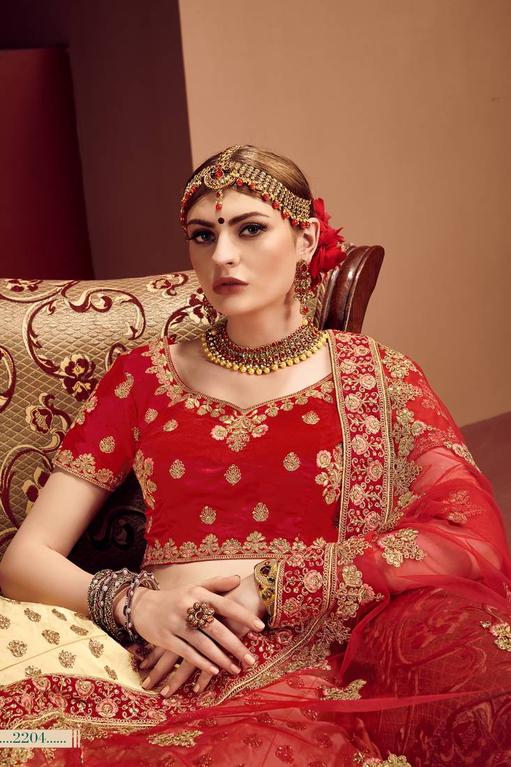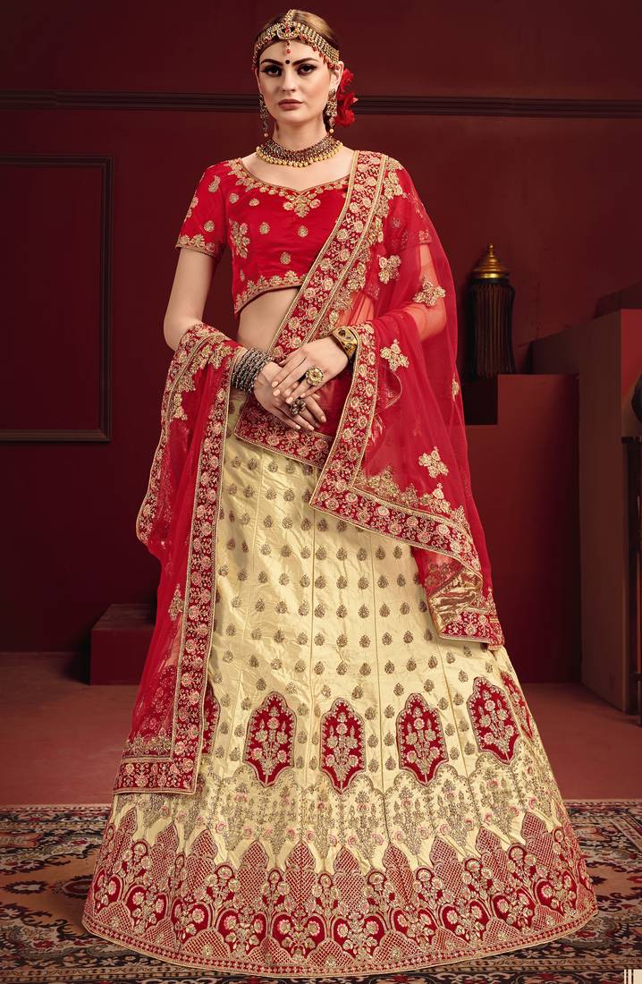 Product Description | Main Color: Beige, Red; Lehenga Choli Fabric: Satin; Dupatta Fabric: Soft Net; Size: Upto 42 Bust And Waist; Work: Glitter Dori,Zari,Stone,Thread; |