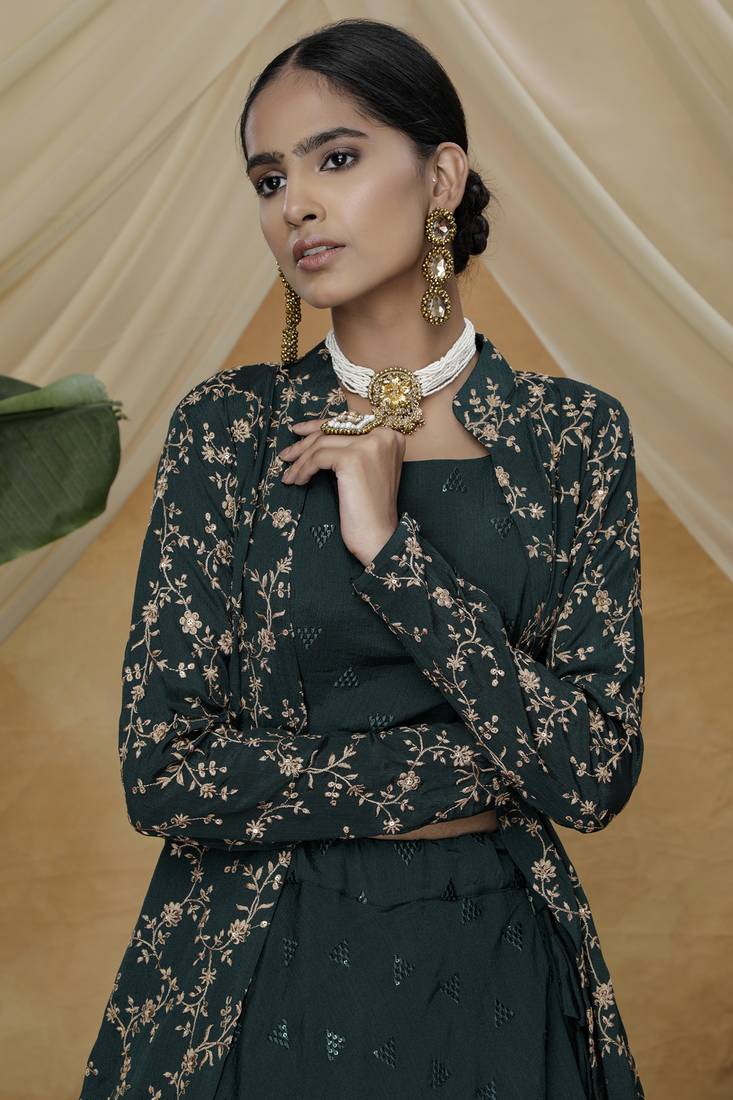 Product Name | Green Thread And Sequins Embroidered Chinon Semi Stitched Lehenga Choli With Jacket | |