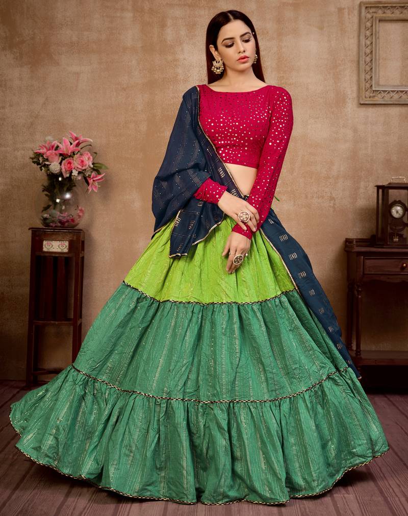• Lehenga Color: Green; Blouse Color: Rani; Dupatta Color: Navy Blue; • Lehenga Fabric: |