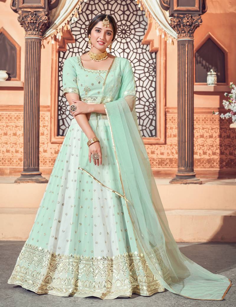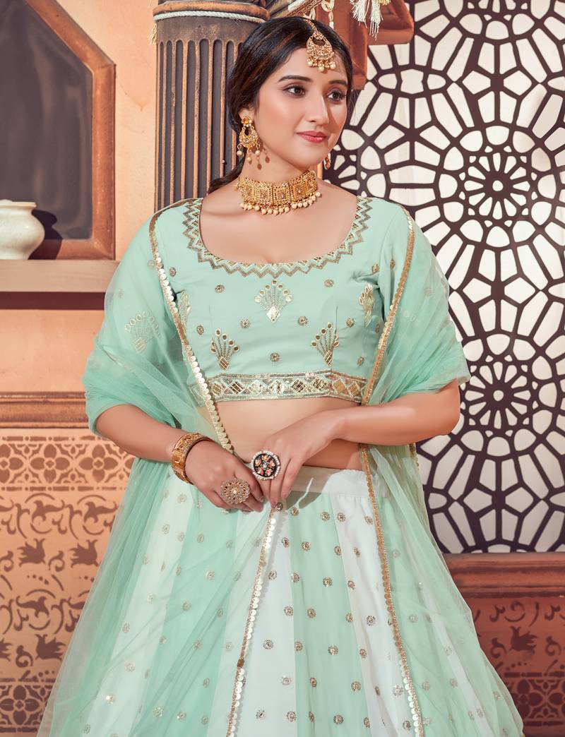 Product Description | Lehenga Choli Color: Light Green White; Dupatta Color: Pista Green; |