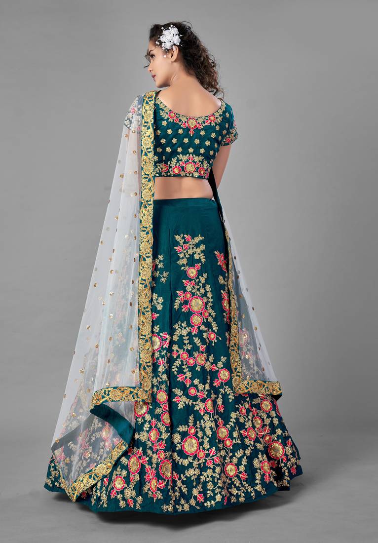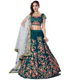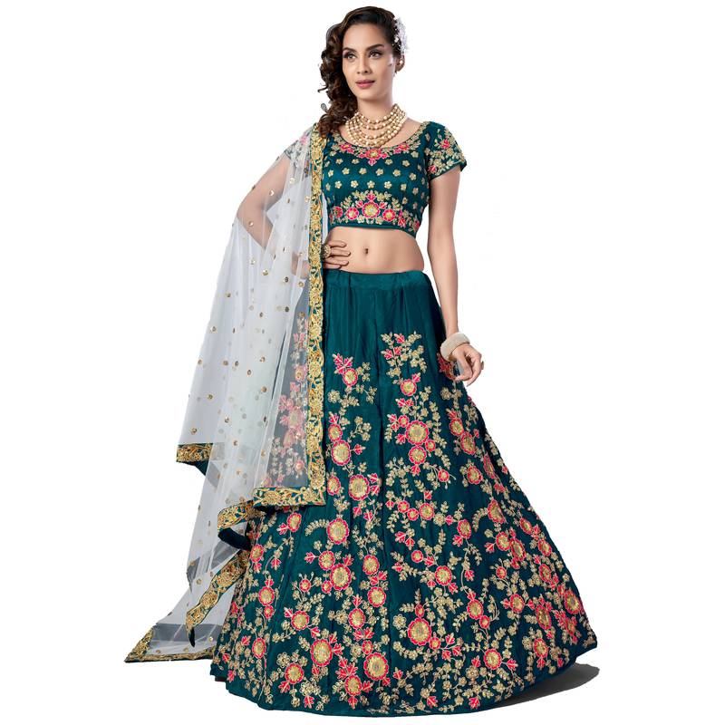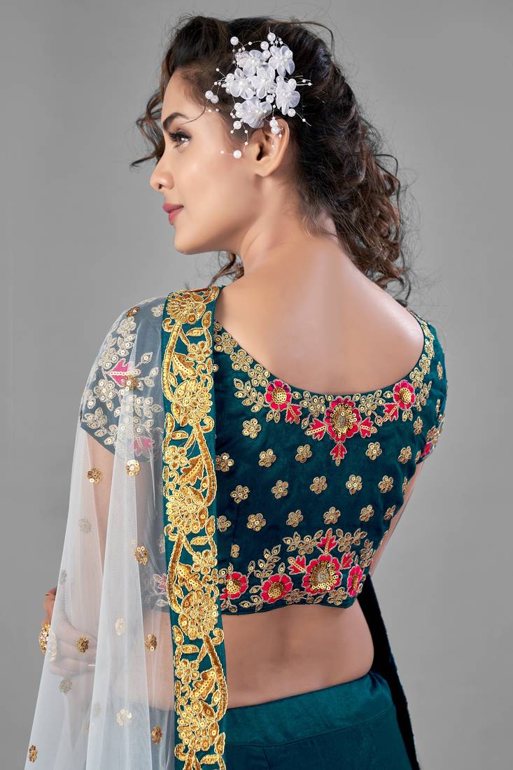 Product Description | Color: Rama Green; Fabric: Satin Velvet; || Lehenga Detail: Finish Type: Semi Stitched; Waist Size Can Customize Up To 42 Inch; Hip Size: 46 Inch; Length: 42 Inch; || Blouse Detail: Finish Type: Unstitched; Length: 0.80 Meter; Bust Size Can Customize Up To 42 Inch; Sleeve Type: Half Sleeve; Neck Type: Round Neck; || Dupatta Detail: Size: 2.50 Meter; || Work: Thread, Sequins, Dori, Embroidery; || Occasion: Wedding; Party; Ceremony; Festival; Function; Casual; Bridal; |
