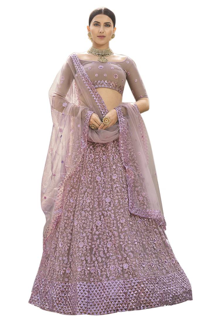 Lilac thread ans sequins embroidered net semi stitched bridal lehenga