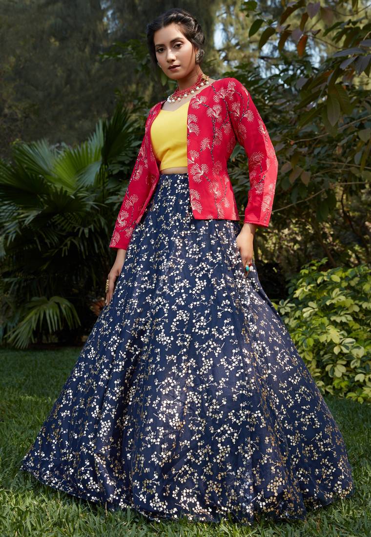 Product Description | Lehenga Detail: Color: Navy Blue; Fabric: Net; Work: Metallic Foil Printed Work; Finish Type: Semi Stitched( Up To 42 Inch); Can Can Not Available || Choli Detail: Color: Yellow; Fabric: Georgette; Work: Na; Length: 0.80 Mtr; Finish Type: Unstitched(Bust Size Up To 42 Inch); || Koti Detail: Color: Pink; Fabric: Georgette; Work: Pigment Foil Work; Length: 1mtr; Finish Type: Ready To Wear || Occasion : Wedding & Party Wear; Look: Bridal; Pattern: Bridesmaid; |