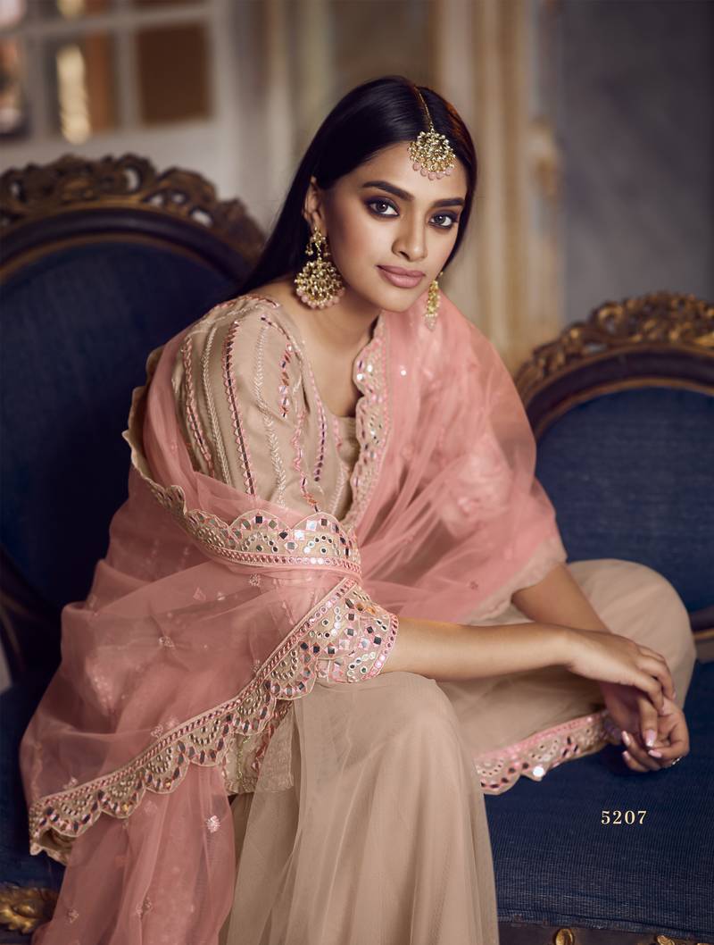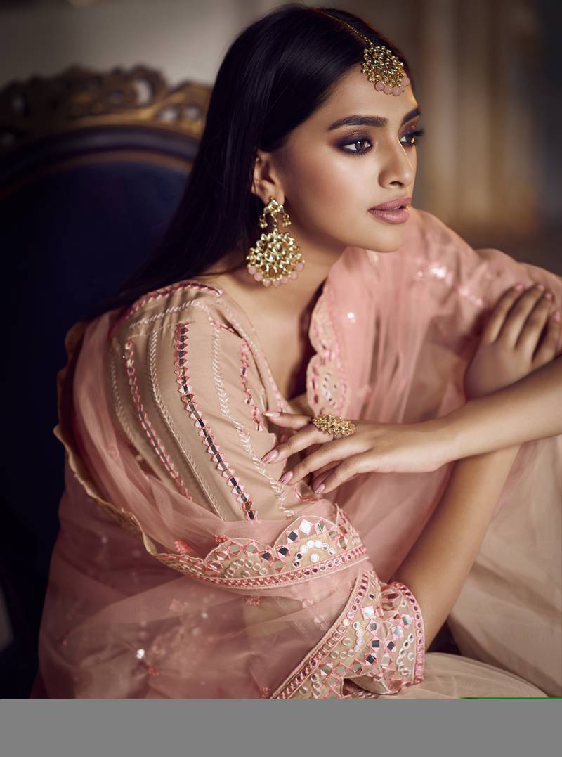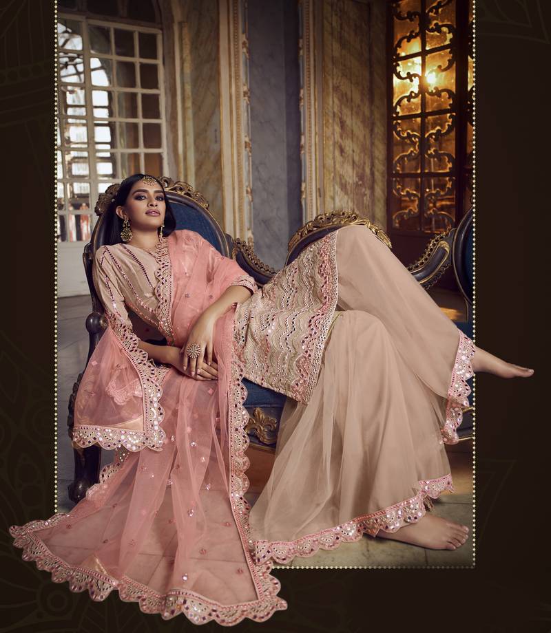 Product Name | Peach Thread Embroidered With Foil Mirror Organza Gharara Suit | |