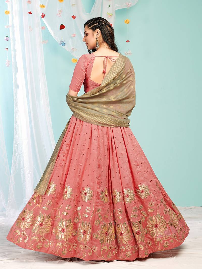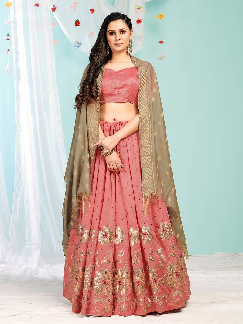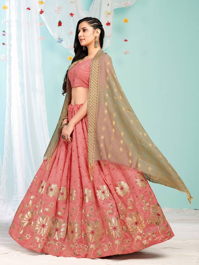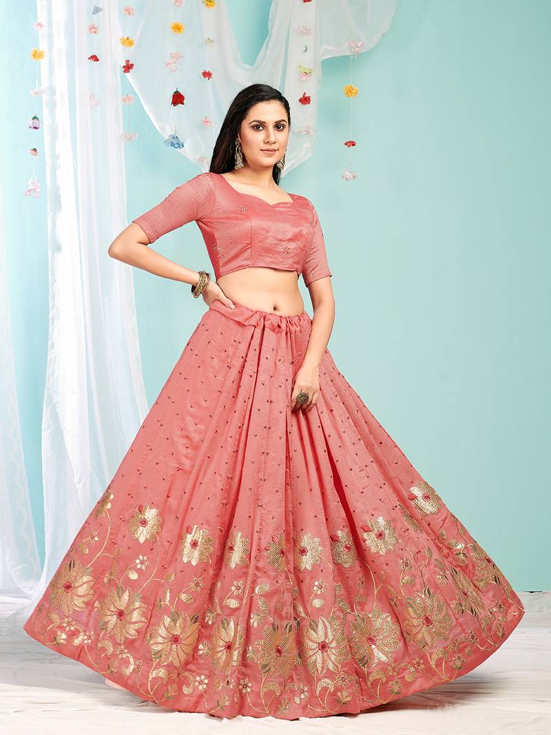 Product Name | Eay Catching Peach Gotta Patti With Zari Embroidered Satin Semi Stitched Lehenga | |