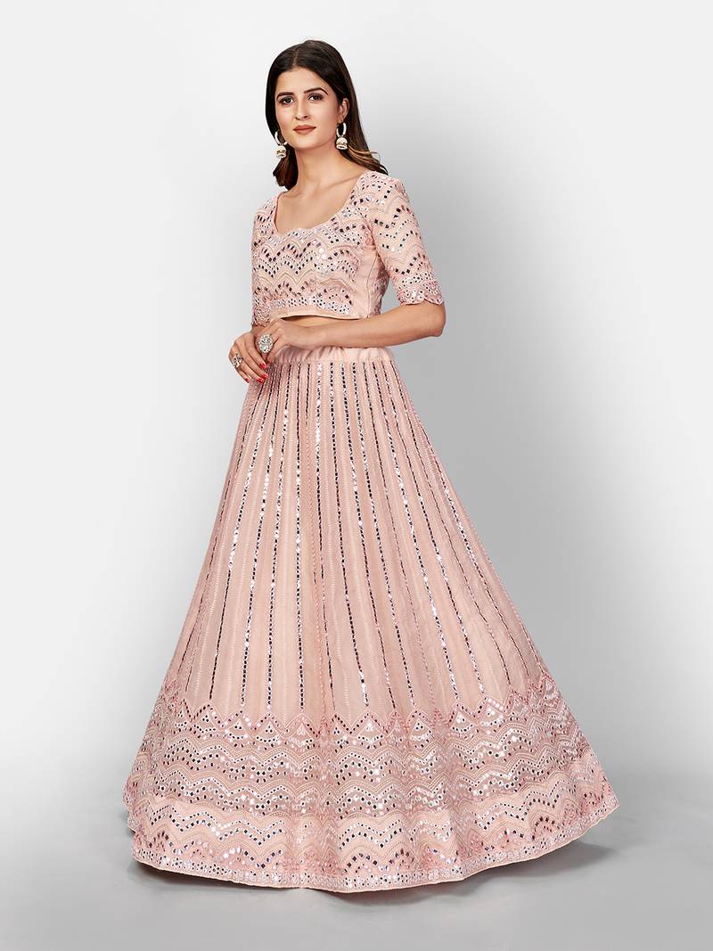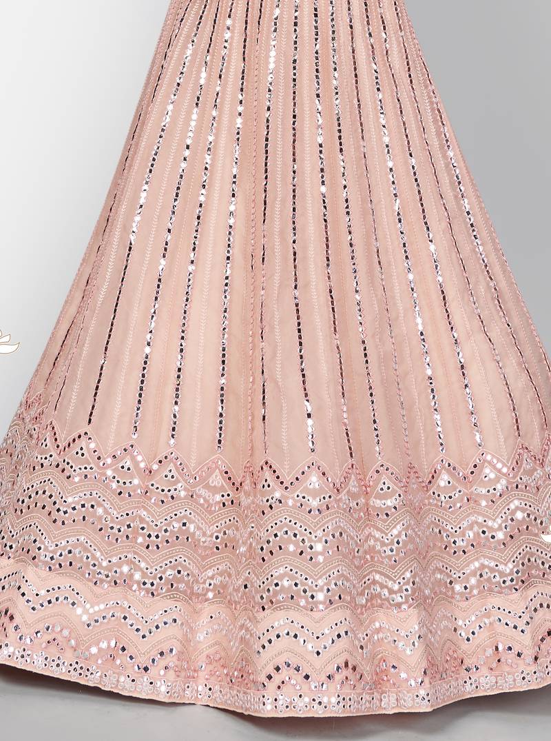 Beauteous peach thread embroidered with foil mirror soft tissue organza semi stitched lehenga