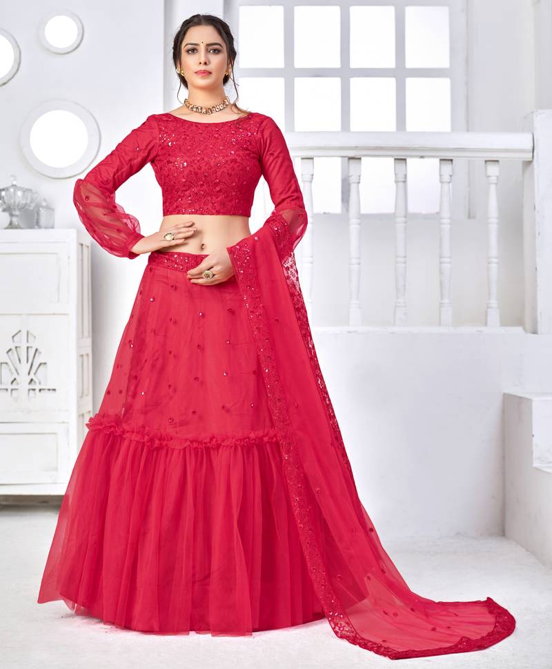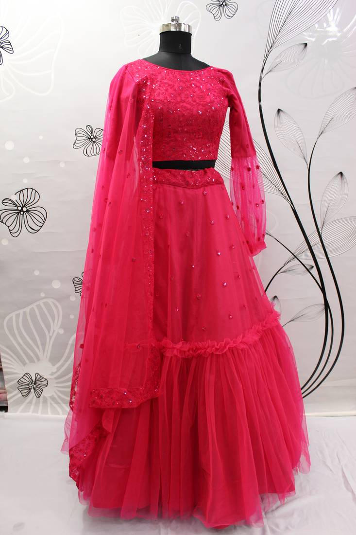 Rani pink thread with sequins embroidered net semi stitched party lehenga