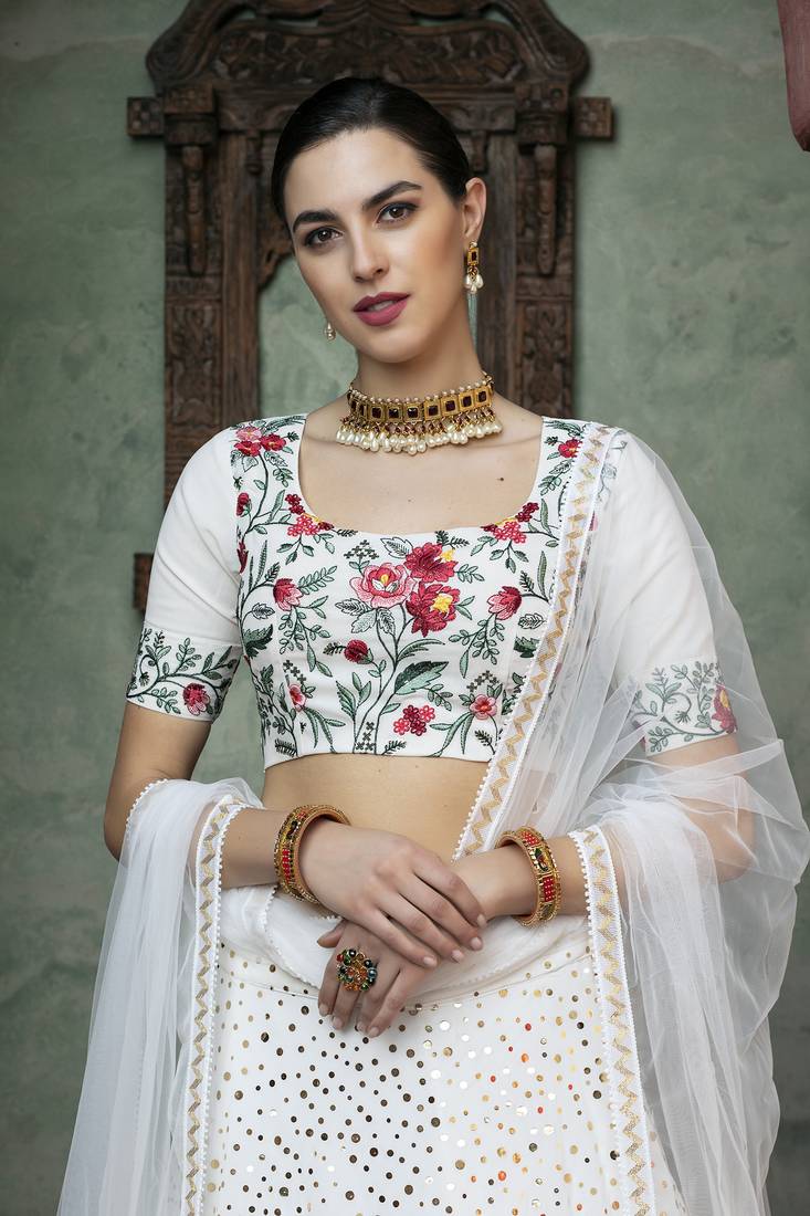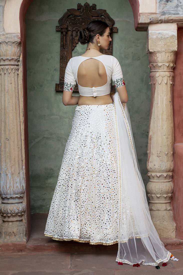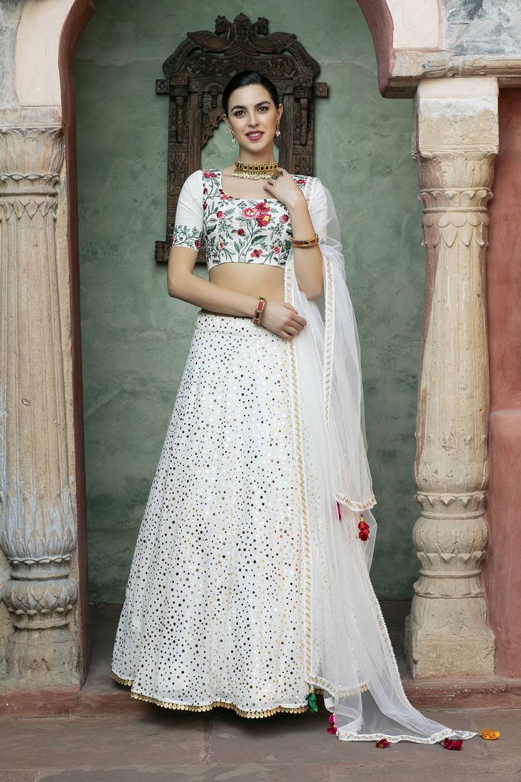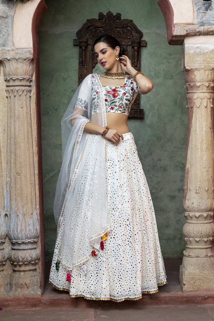 Product Name | White Fancy Sequins Embroidered With Glistening Embellished Georgette Semi Stitched Lehenga | |