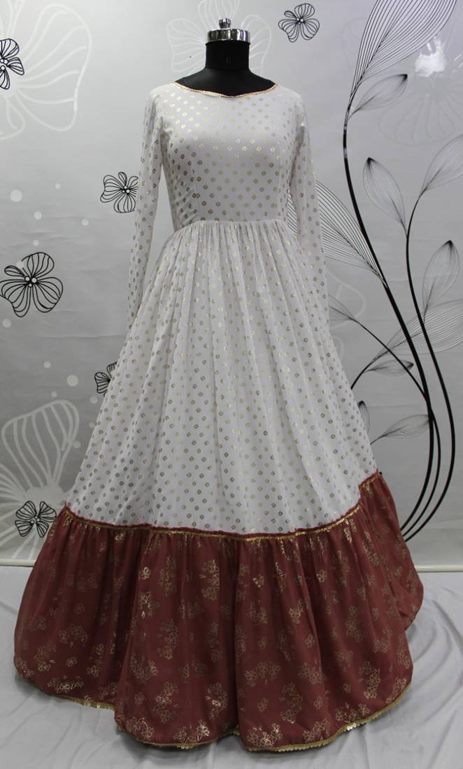 Product Name | White & Brown Metallic Foilage Print Georgette Anarkali Long Gown | |