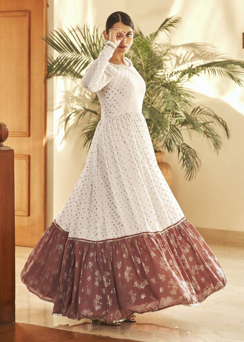 White & brown metallic foilage print georgette anarkali long gown semi stitched