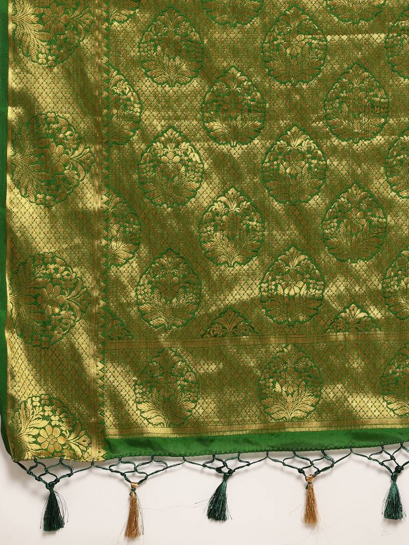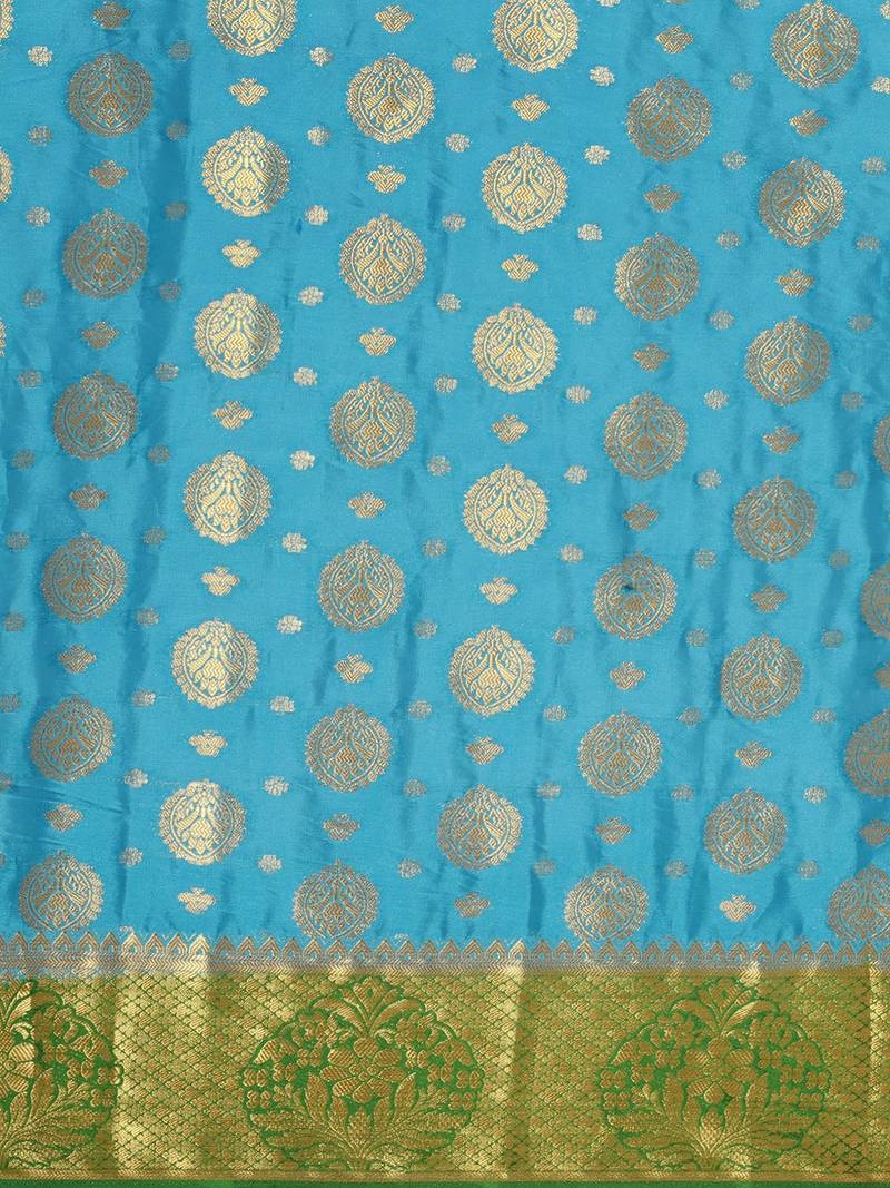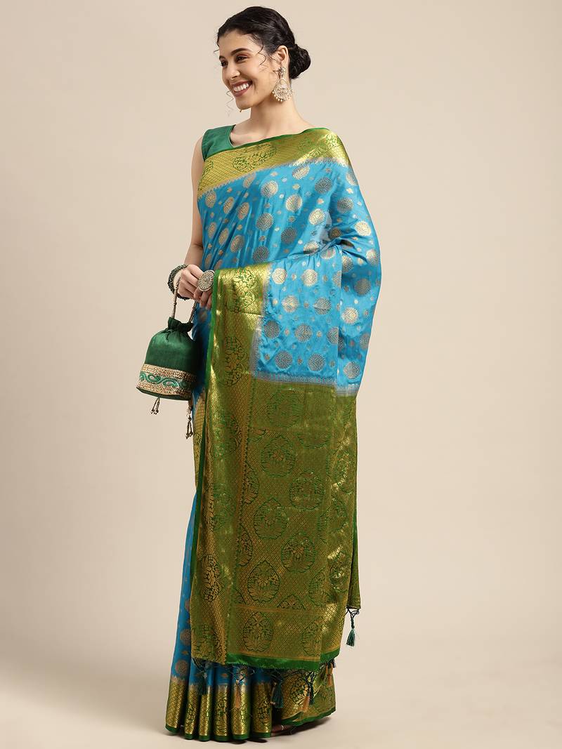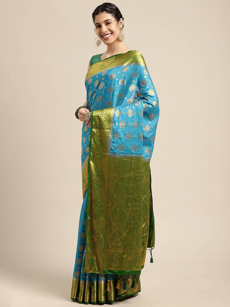 | Product Description | Blue Color Traditional Saree, With Woven Zari Butty All Over, Has Zari Woven Border And Pallu And Tussel Work At The End , Comes With Green Color Contrast Unstiched Brocade Blouse (Attached At The Last Of Saree) |