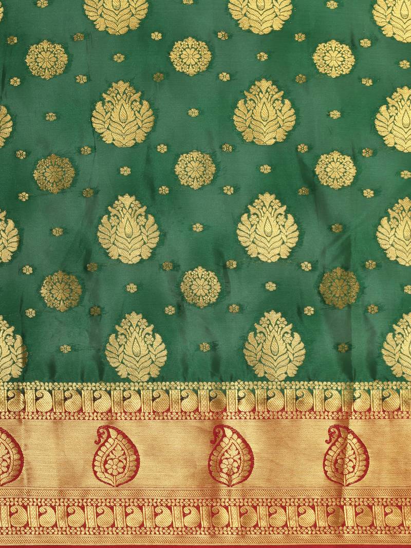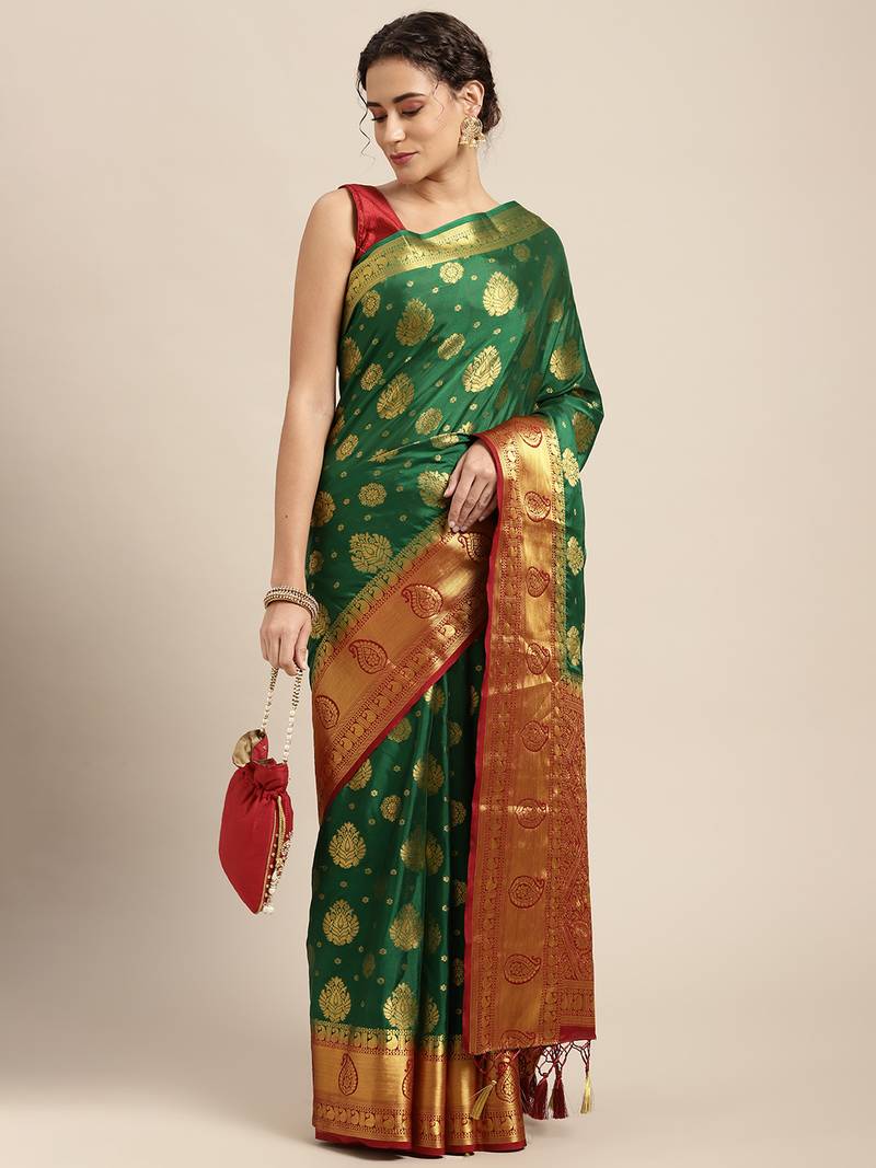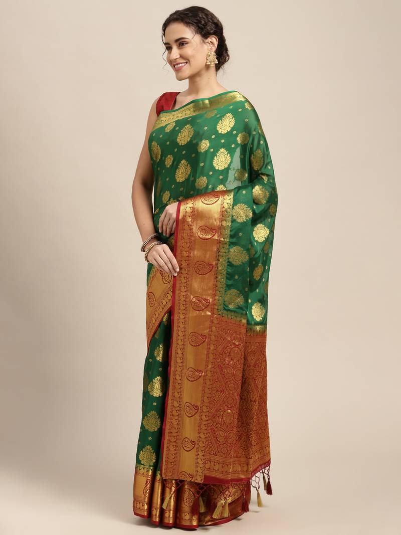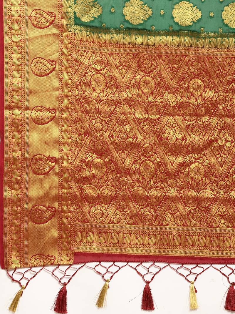 | Product Description | Green Color Traditional Saree, With Woven Zari Butty All Over, Has Zari Woven Border And Pallu And Tussel Work At The End , Comes With Maroon Color Contrast Unstiched Brocade Blouse (Attached At The Last Of Saree) |