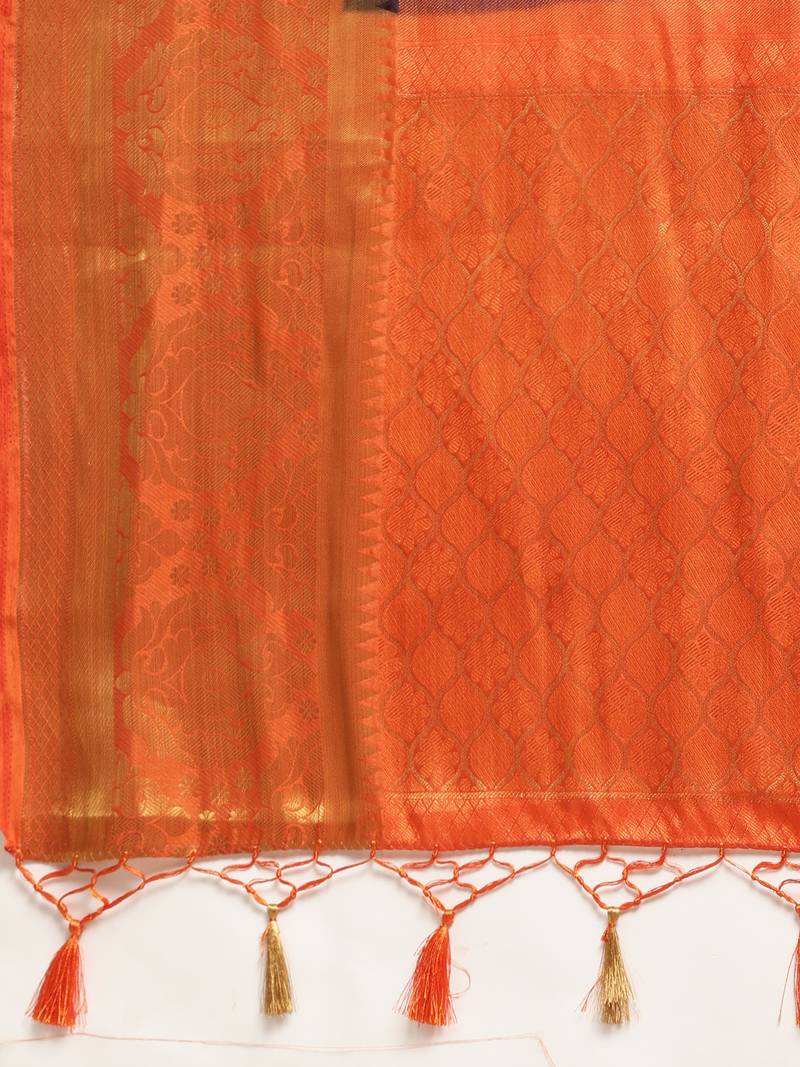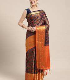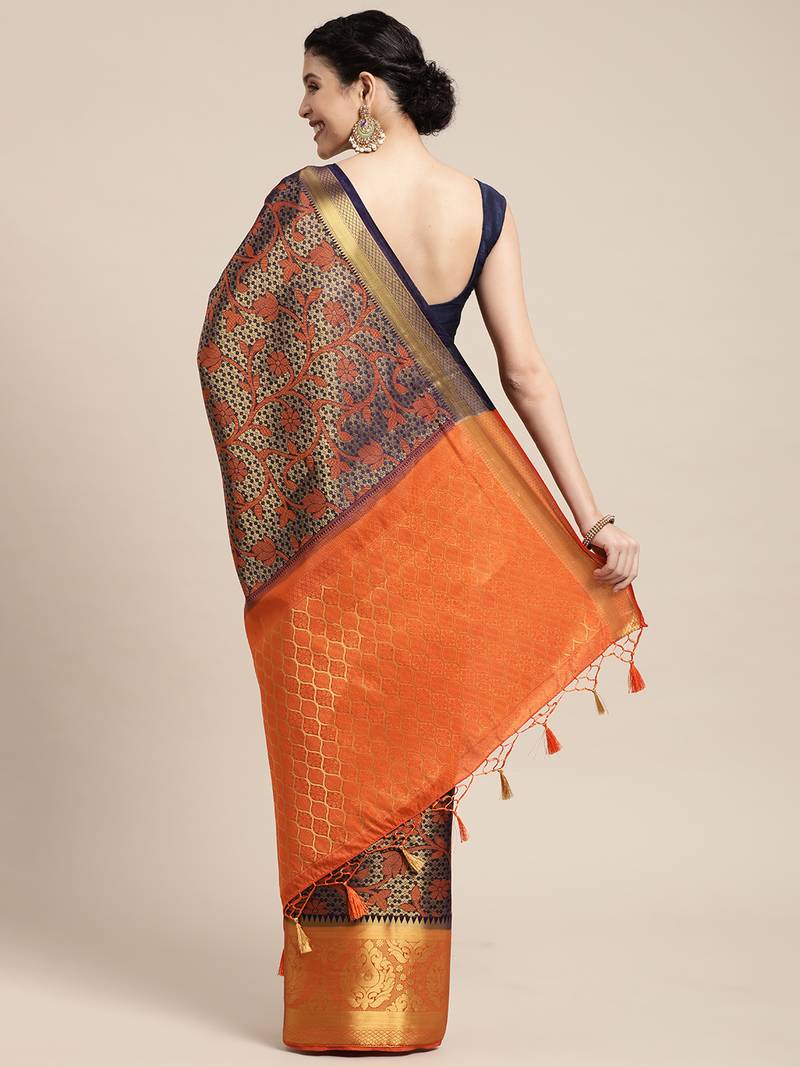 | Product Description | Navy Blue Color Traditional Saree, With Woven Mixture Of Zari And Kalamkari Thread Design All Over , Has Zari Woven Border And Pallu And Tussel Work At The End , Comes With Orange Color Contrast Unstiched Brocade Blouse (Attached At The Last Of Saree) |