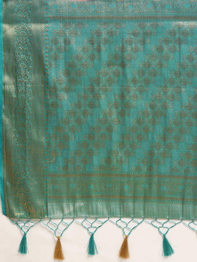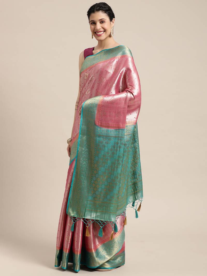 | Product Description | P Ink Color Traditional Saree, With Woven Mixture Of Zari And Gicha Thread Design All Over , Has Zari Woven Border And Pallu And Tussel Work At The End , Comes With Turquoise Blue Color Contrast Unstiched Brocade Blouse (Attached At The Last Of Saree) |