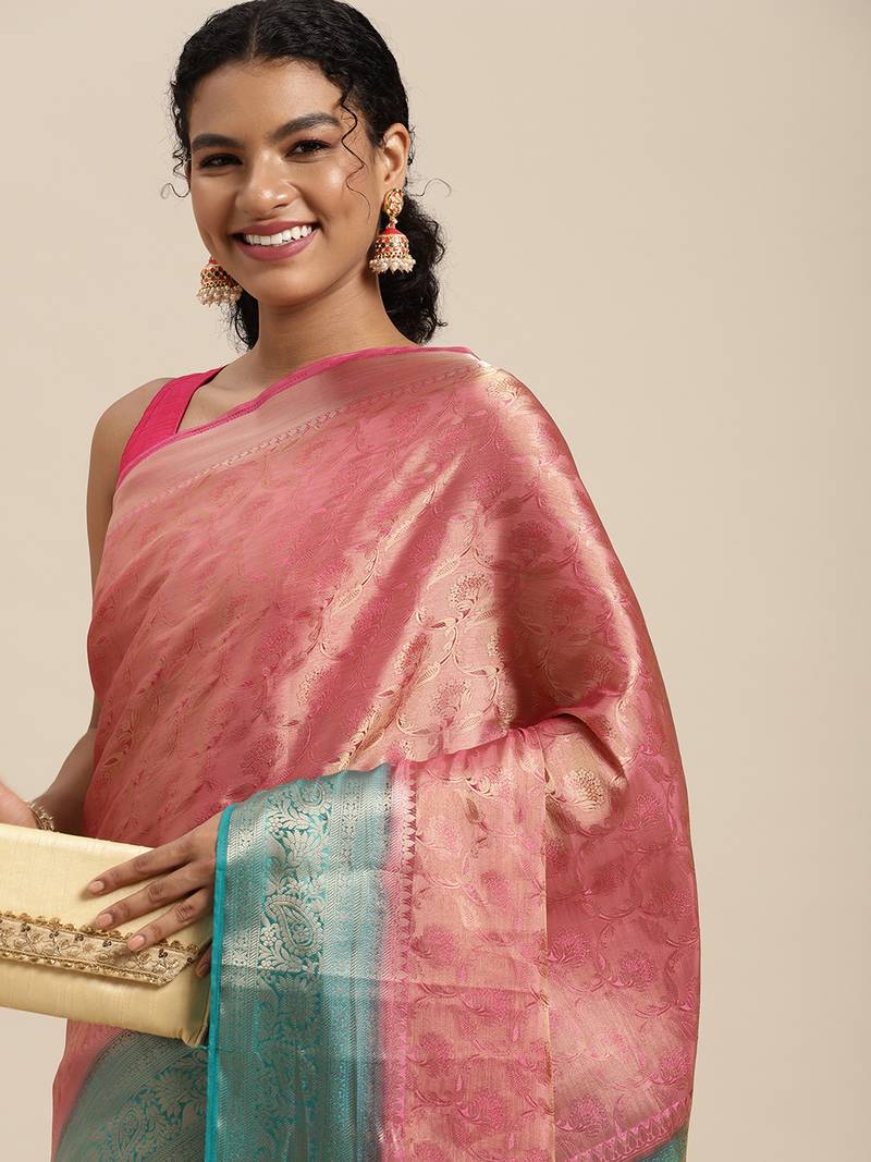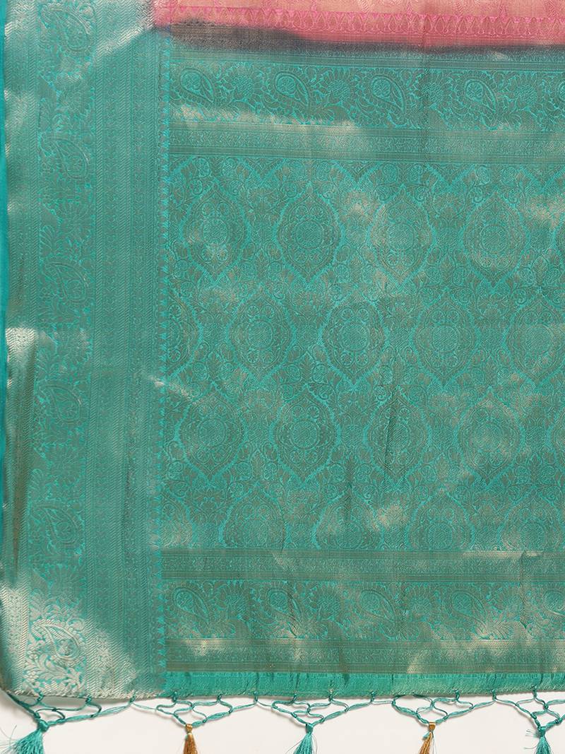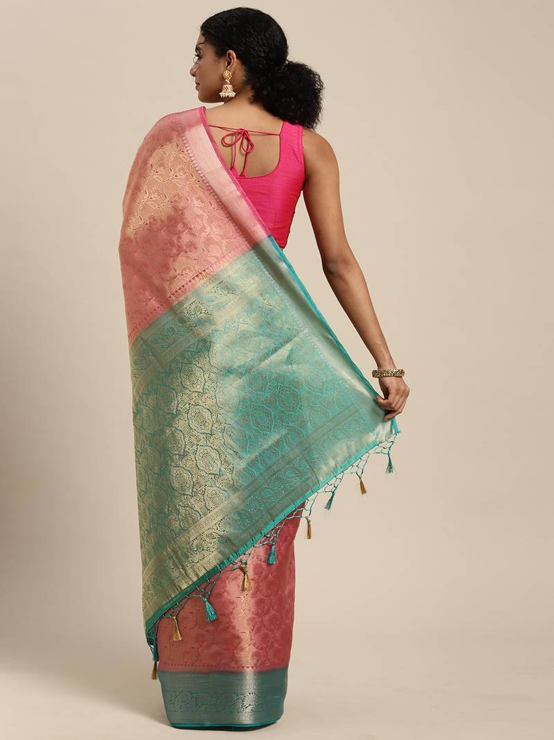 | Product Description | Pink Color Traditional Saree, With Woven Zari Design All Over , Has Zari Woven Border And Pallu And Tussel Work At The End , Comes With Turquoise Blue Color Contrast Unstiched Brocade Blouse (Attached At The Last Of Saree) |