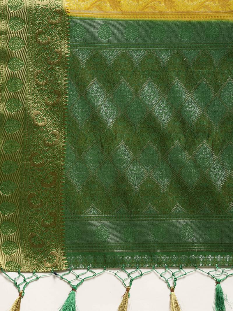 | Product Description | Yellow Color Traditional Saree, With Woven Embose And Zari Design All Over , Has Zari Woven Border And Pallu And Tussel Work At The End , Comes With Green Color Contrast Unstiched Brocade Blouse (Attached At The Last Of Saree) |