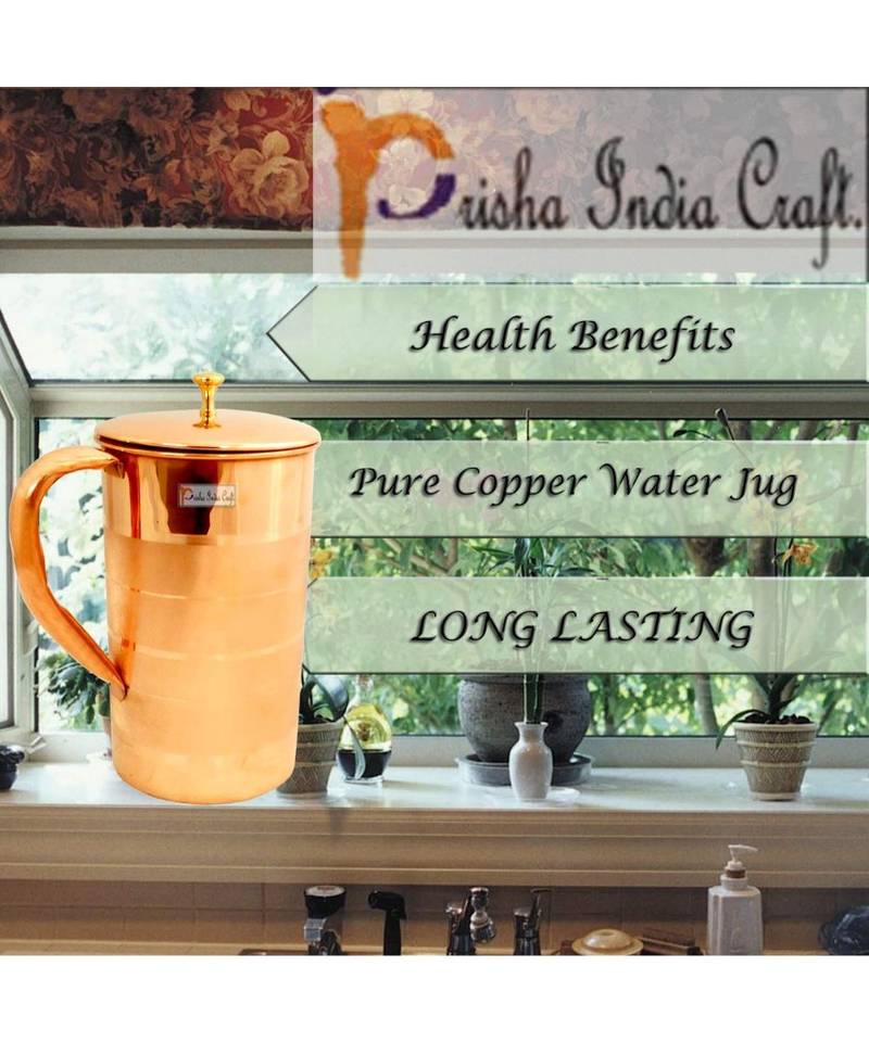 Product Description | Features: Pure Copper Jug With Lid And 1 Tumbler, Material: Copper, Color: Copper, Jug Dimension: Weight(Grams): 550, Volume (Ml): 2000, Height(Inch): 8.00", Width/Diameter(Inch): 4.50" | Glass Dimension: Height: 4.50 Inch, Width/Diameter: 3.00 Inch, Weight: 80 Gram, Capacity 300 Ml | Note* On Purchase You Will Get: 1 Pure Copper Jug , 1 Copper Tumbler , 1 Copper Cleaning Powder Best Quality Elegent Gift |