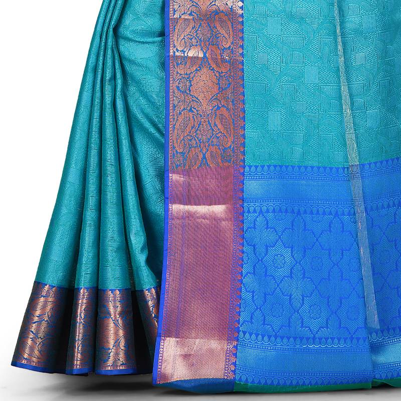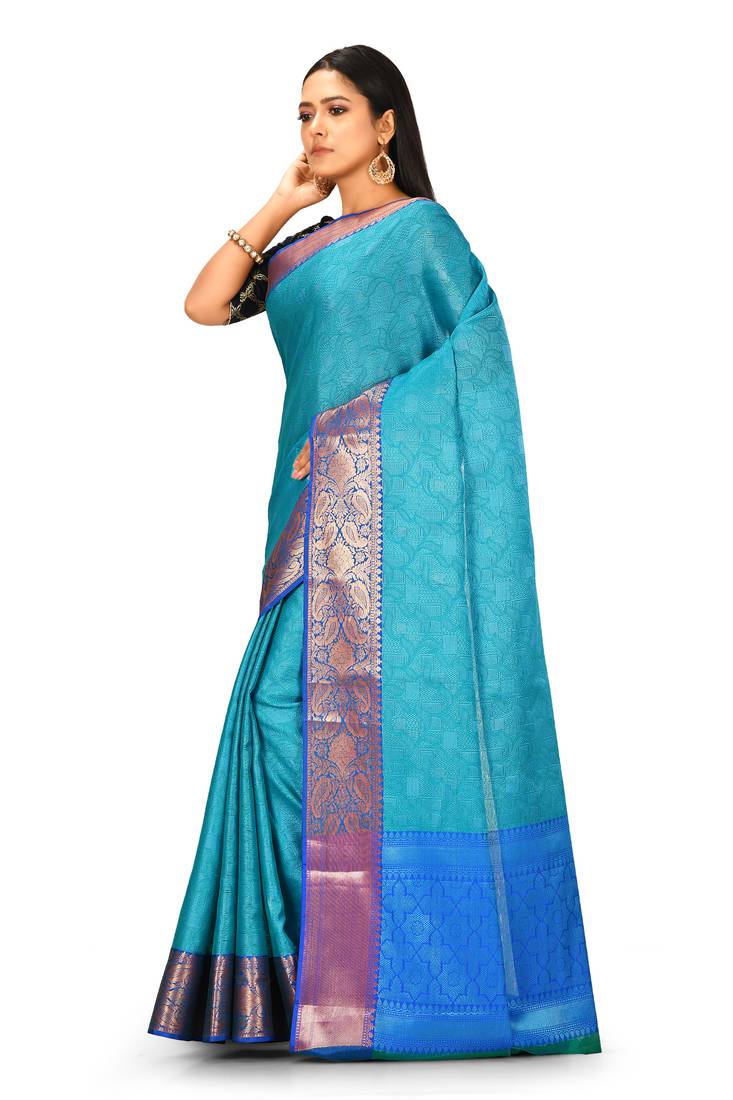 Product Description | Teal Blue Banarasi Woven Tanchoi Muslin Silk Saree With Blouse |The Last Image Gives A Detailed Look Of The Blouse Piece That Comes With This Saree (The Model Is Wearing A Blouse From Our In House Wardrobe) |
